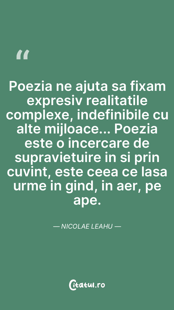Poezia ne ajuta sa fixam expresiv realitatile complexe, indefinibile cu alte mijloace... Poezia este o incercare de supravietuire in si prin cuvint, este ceea ce lasa urme in gind, in aer, pe ape. Nicolae Leahu