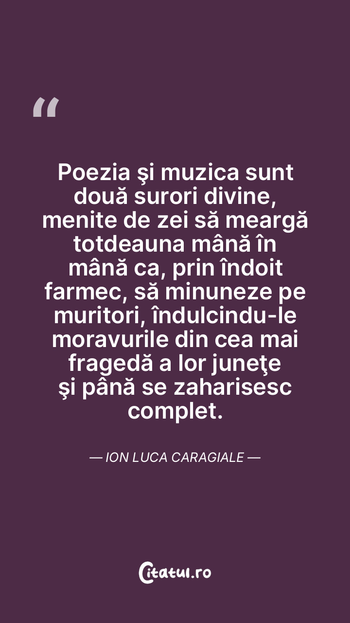 Poezia şi muzica sunt două surori divine, menite de zei să meargă totdeauna mână în mână ca, prin îndoit farmec, să minuneze pe muritori, îndulcindu-le moravurile din cea mai fragedă a lor juneţe şi până se zaharisesc complet. Ion Luca Caragiale