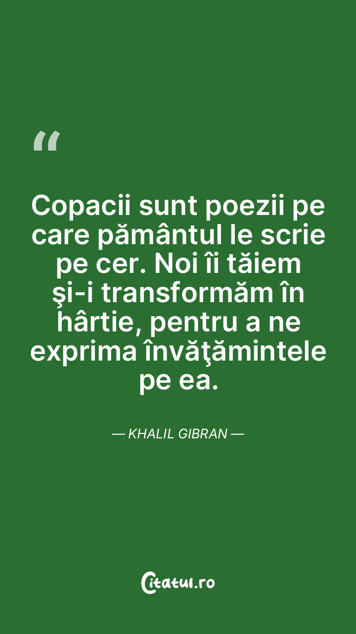 Copacii sunt poezii pe care pământul le scrie pe cer. Noi îi tăiem şi-i transformăm în hârtie, pentru a ne exprima învăţămintele pe ea. Khalil Gibran