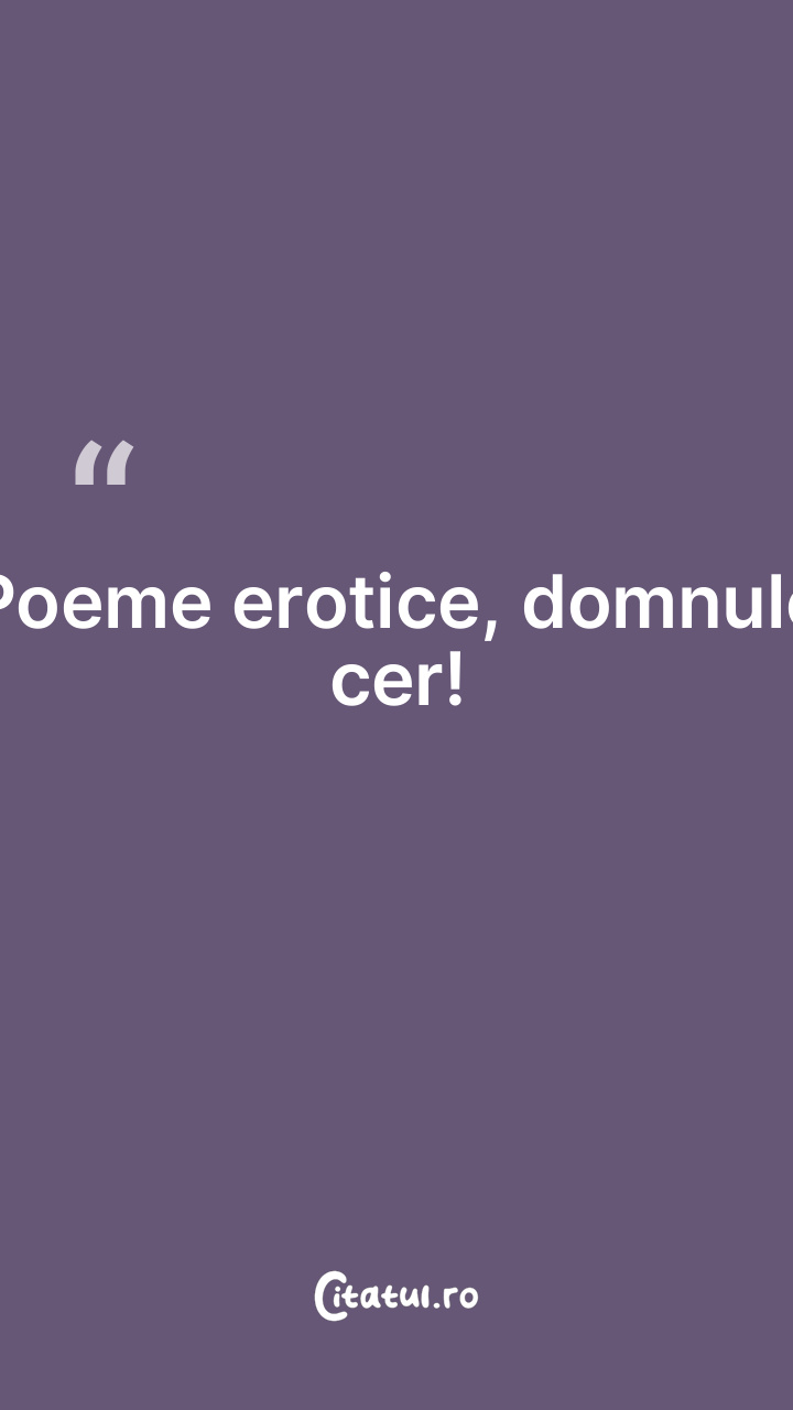 Poeme erotice, domnule cer! ... Categorie: citate spiritualitate Dificultate: Foarte ușor de citit! Votează: ★ ★ ★ ★ ★ (0/5 din 0) Distribuiți acest citat? Alegeți platforma preferată: Salvează citatul in telefon/pc Poeme erotice, domnule cer! Copiază Favorite Eroare
