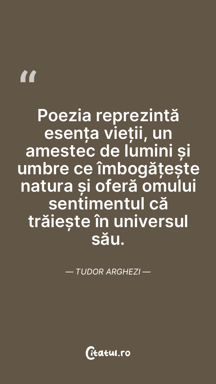 Poezia reprezintă esența vieții, un amestec de lumini și umbre ce îmbogățește natura și oferă omului sentimentul că trăiește în universul său. Tudor Arghezi