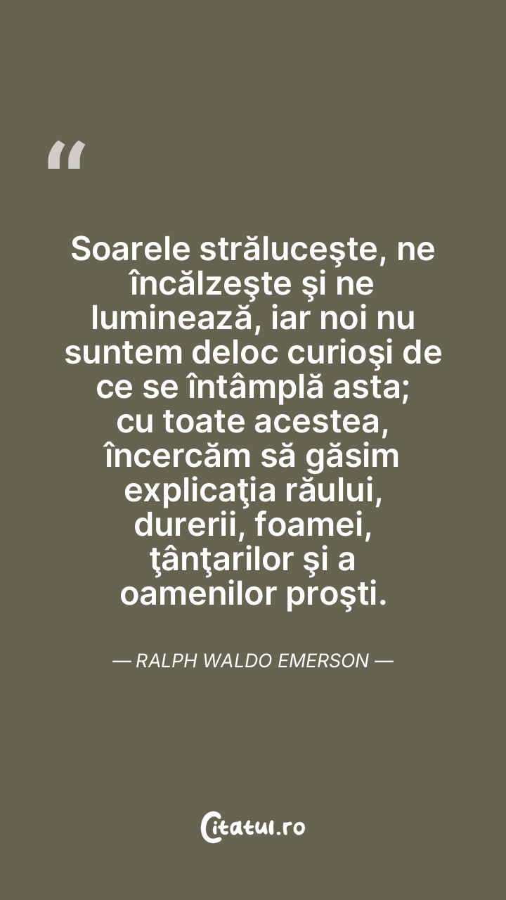Soarele străluceşte, ne încălzeşte şi ne luminează, iar noi nu suntem deloc curioşi de ce se întâmplă asta; cu toate acestea, încercăm să găsim explicaţia răului, durerii, foamei, ţânţarilor şi a oamenilor proşti. Ralph Waldo Emerson