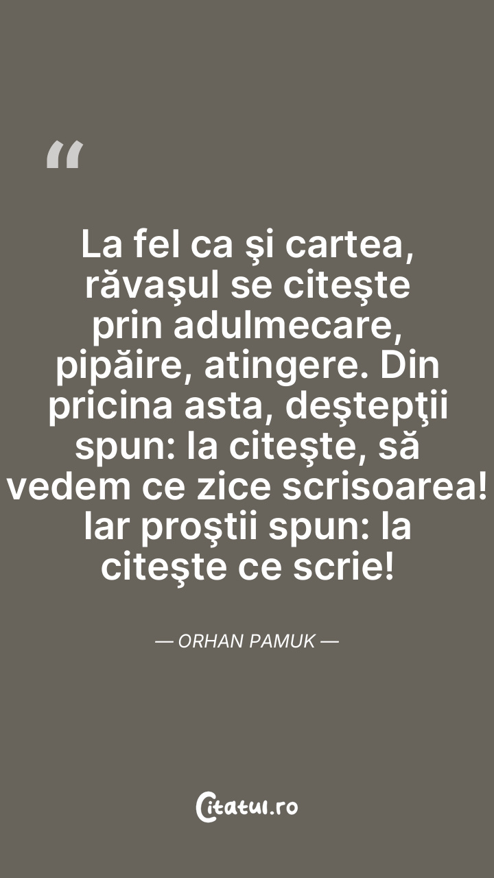 La fel ca şi cartea, răvaşul se citeşte prin adulmecare, pipăire, atingere. Din pricina asta, deştepţii spun: Ia citeşte, să vedem ce zice scrisoarea! Iar proştii spun: Ia citeşte ce scrie! Orhan Pamuk