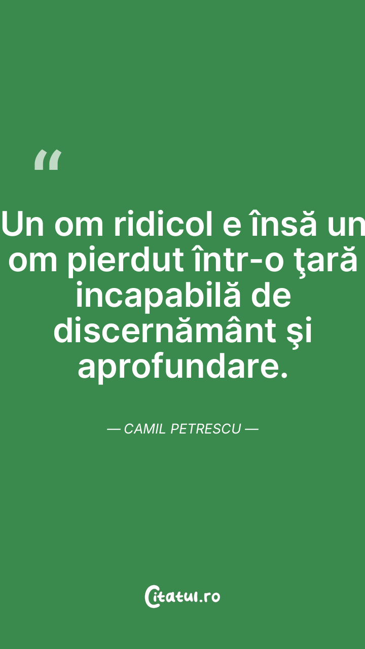 Un om ridicol e însă un om pierdut într-o ţară incapabilă de discernământ şi aprofundare. Camil Petrescu