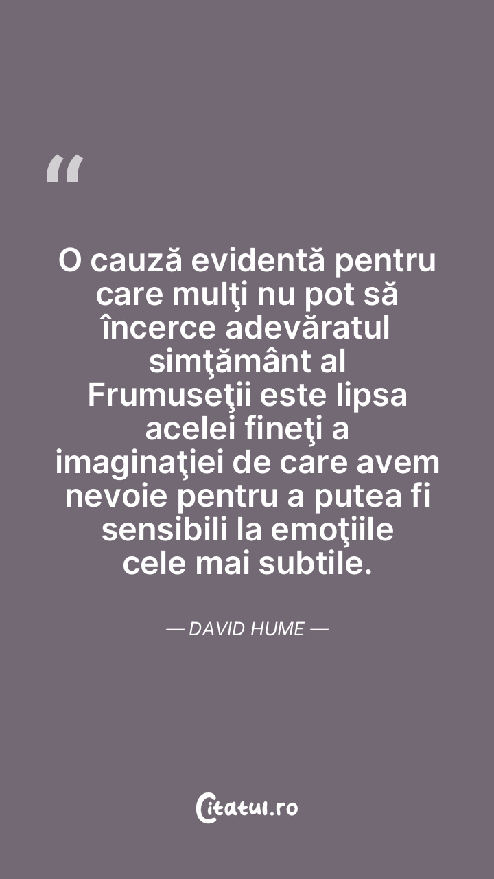 O cauză evidentă pentru care mulţi nu pot să încerce adevăratul simţământ al Frumuseţii este lipsa acelei fineţi a imaginaţiei de care avem nevoie pentru a putea fi sensibili la emoţiile cele mai subtile. David Hume