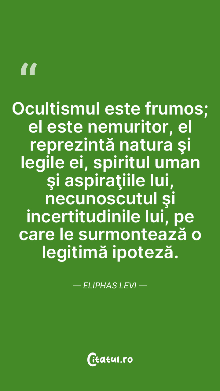 Ocultismul este frumos; el este nemuritor, el reprezintă natura şi legile ei, spiritul uman şi aspiraţiile lui, necunoscutul şi incertitudinile lui, pe care le surmontează o legitimă ipoteză. Eliphas Levi