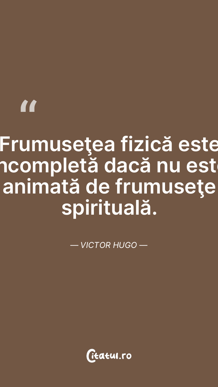 Frumuseţea fizică este incompletă dacă nu este animată de frumuseţe spirituală. Victor Hugo