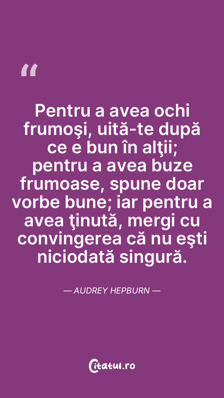 Pentru a avea ochi frumoşi, uită-te după ce e bun în alţii; pentru a avea buze frumoase, spune doar vorbe bune; iar pentru a avea ţinută, mergi cu convingerea că nu eşti niciodată singură. Audrey Hepburn