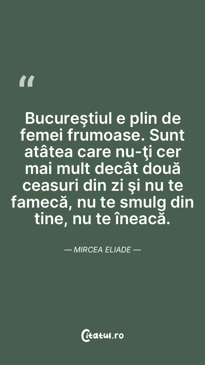 Bucureştiul e plin de femei frumoase. Sunt atâtea care nu-ţi cer mai mult decât două ceasuri din zi şi nu te famecă, nu te smulg din tine, nu te îneacă. Mircea Eliade