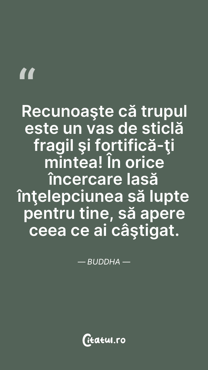 Recunoaşte că trupul este un vas de sticlă fragil şi fortifică-ţi mintea! În orice încercare lasă înţelepciunea să lupte pentru tine, să apere ceea ce ai câştigat. Buddha