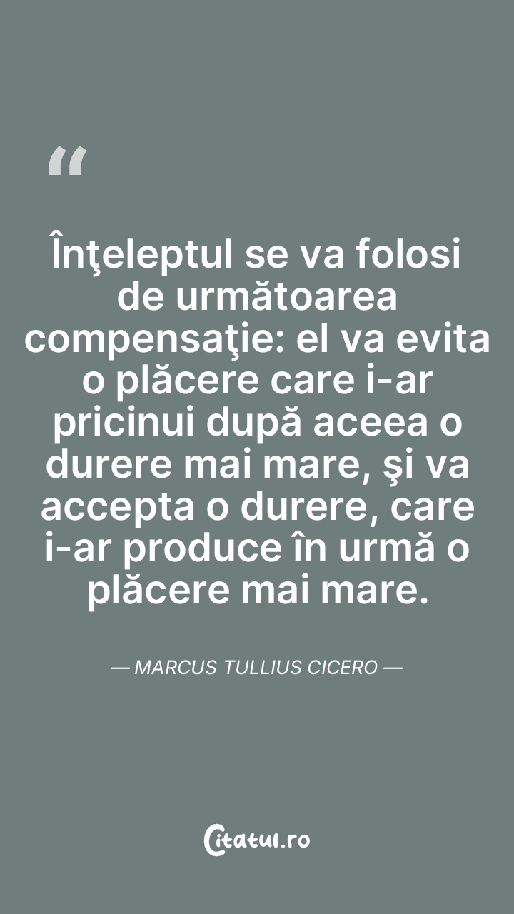 Înţeleptul se va folosi de următoarea compensaţie: el va evita o plăcere care i-ar pricinui după aceea o durere mai mare, şi va accepta o durere, care i-ar produce în urmă o plăcere mai mare. Marcus Tullius Cicero