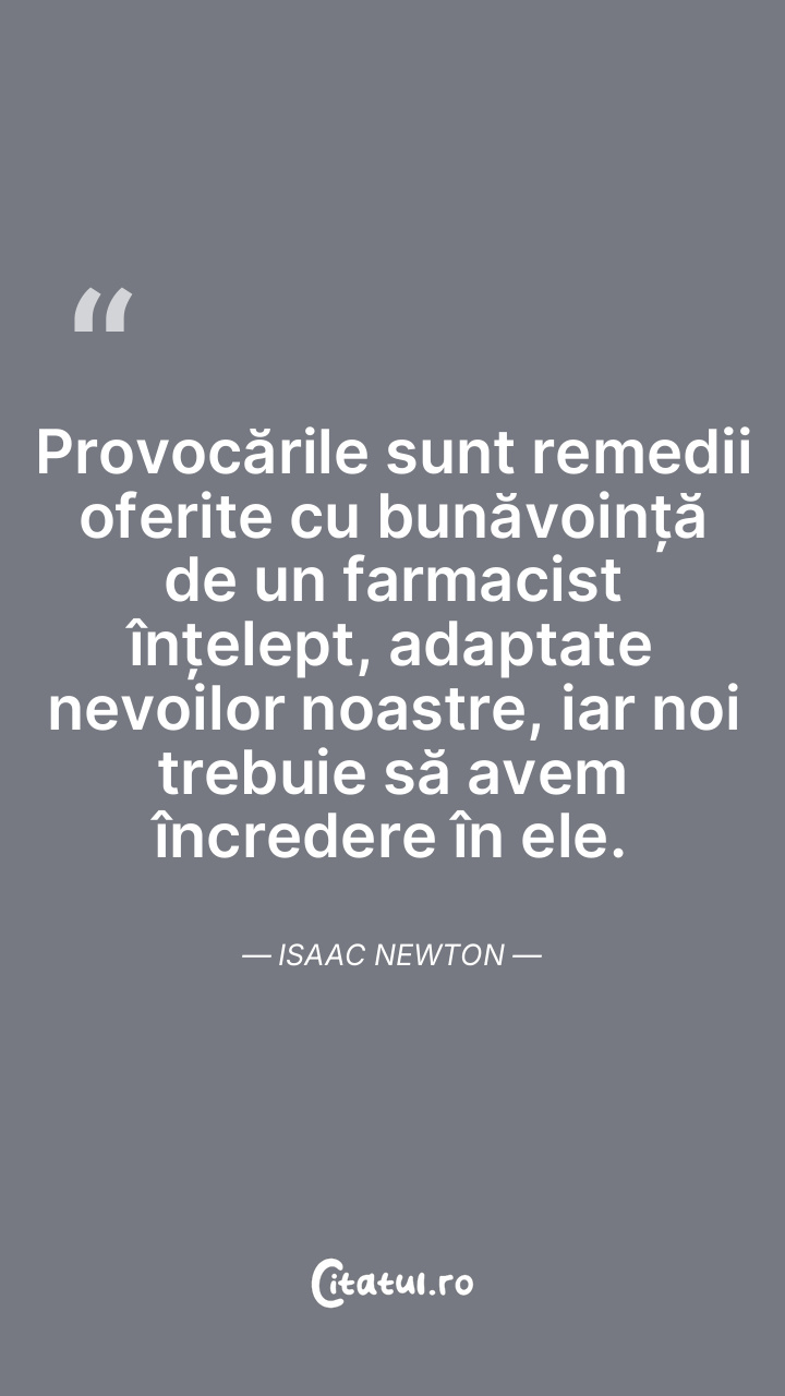 Provocările sunt remedii oferite cu bunăvoință de un farmacist înțelept, adaptate nevoilor noastre, iar noi trebuie să avem încredere în ele. Isaac Newton