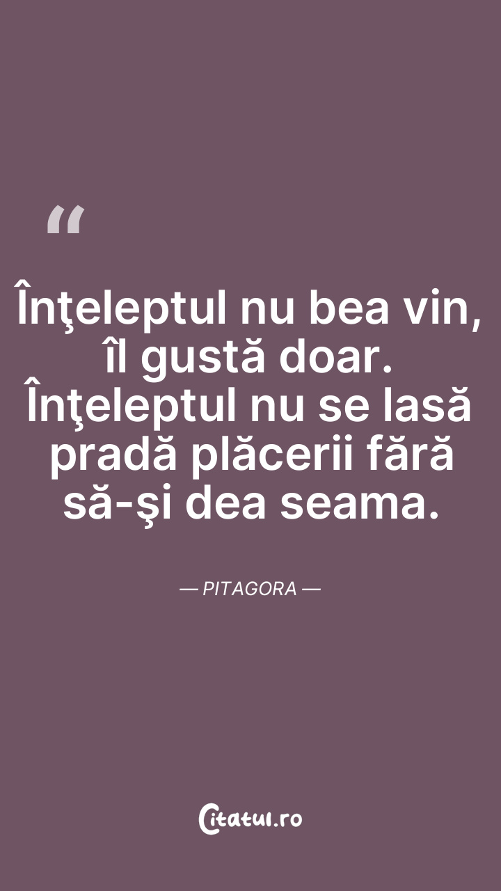 Înţeleptul nu bea vin, îl gustă doar. Înţeleptul nu se lasă pradă plăcerii fără să-şi dea seama. Pitagora
