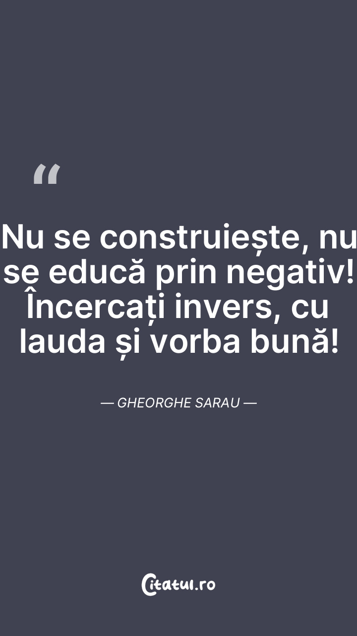 Nu se construiește, nu se educă prin negativ! Încercați invers, cu lauda și vorba bună! Gheorghe Sarau