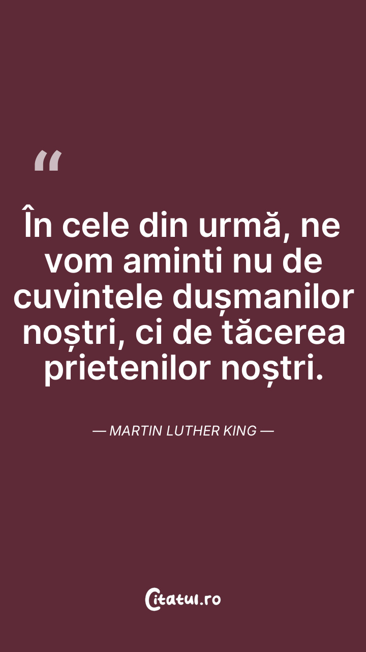 În cele din urmă, ne vom aminti nu de cuvintele dușmanilor noștri, ci de tăcerea prietenilor noștri. Martin Luther King