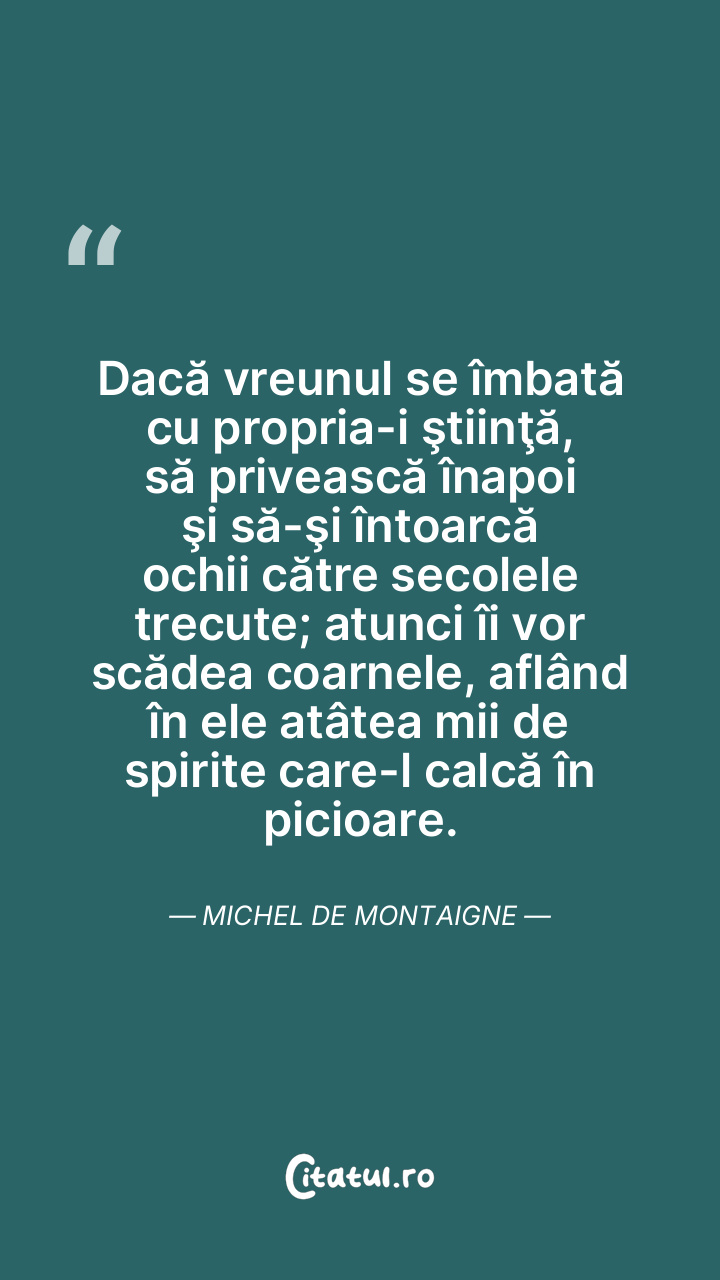 Dacă vreunul se îmbată cu propria-i ştiinţă, să privească înapoi şi să-şi întoarcă ochii către secolele trecute; atunci îi vor scădea coarnele, aflând în ele atâtea mii de spirite care-l calcă în picioare. Michel de Montaigne