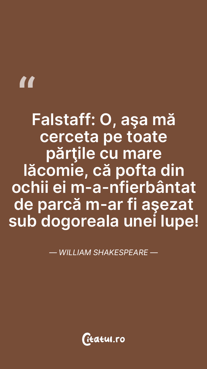 Falstaff: O, aşa mă cerceta pe toate părţile cu mare lăcomie, că pofta din ochii ei m-a-nfierbântat de parcă m-ar fi aşezat sub dogoreala unei lupe! William Shakespeare