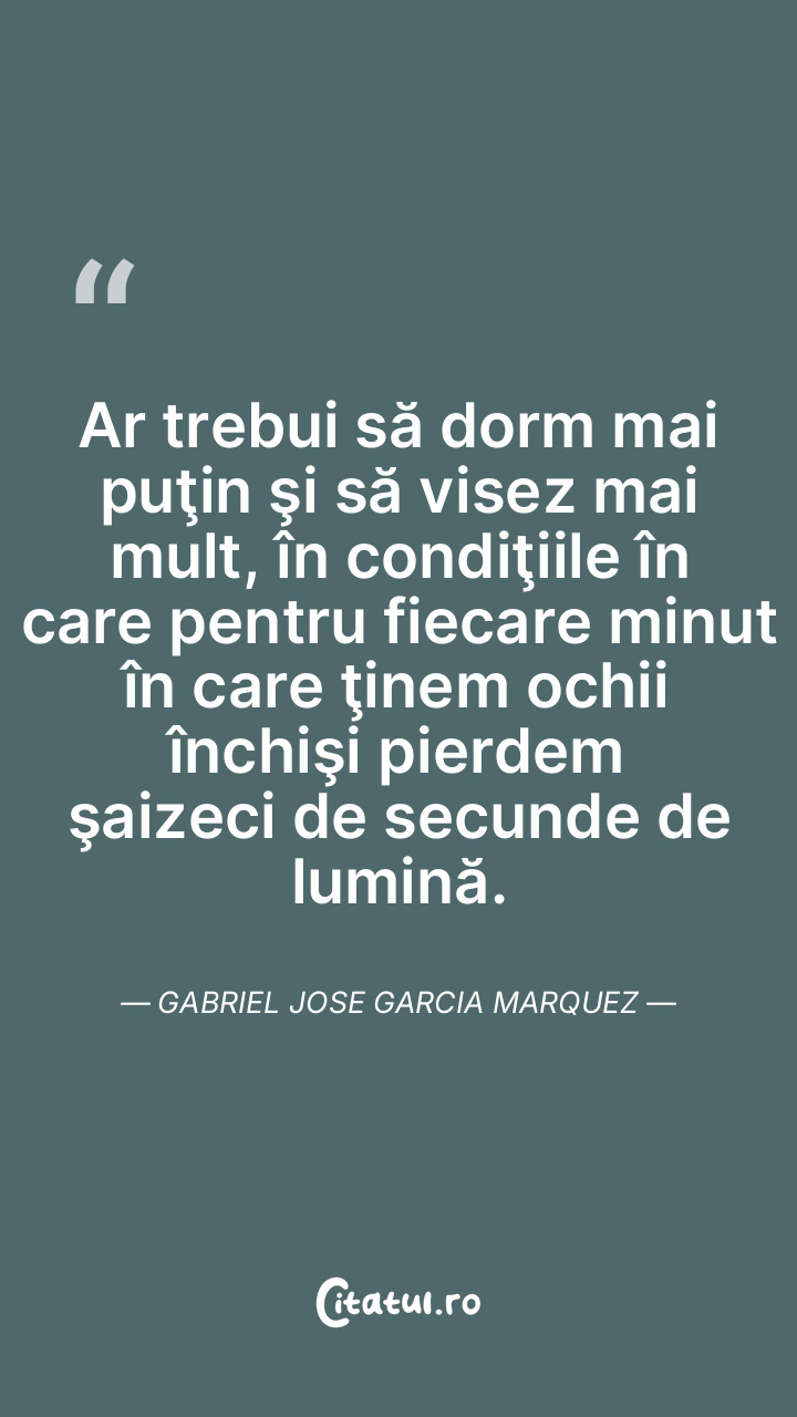 Ar trebui să dorm mai puţin şi să visez mai mult, în condiţiile în care pentru fiecare minut în care ţinem ochii închişi pierdem şaizeci de secunde de lumină. Gabriel Jose Garcia Marquez