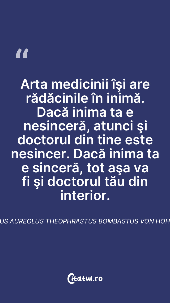 Arta medicinii îşi are rădăcinile în inimă. Dacă inima ta e nesinceră, atunci şi doctorul din tine este nesincer. Dacă inima ta e sinceră, tot aşa va fi şi doctorul tău din interior. Philippus Aureolus Theophrastus Bombastus von Hohenheim