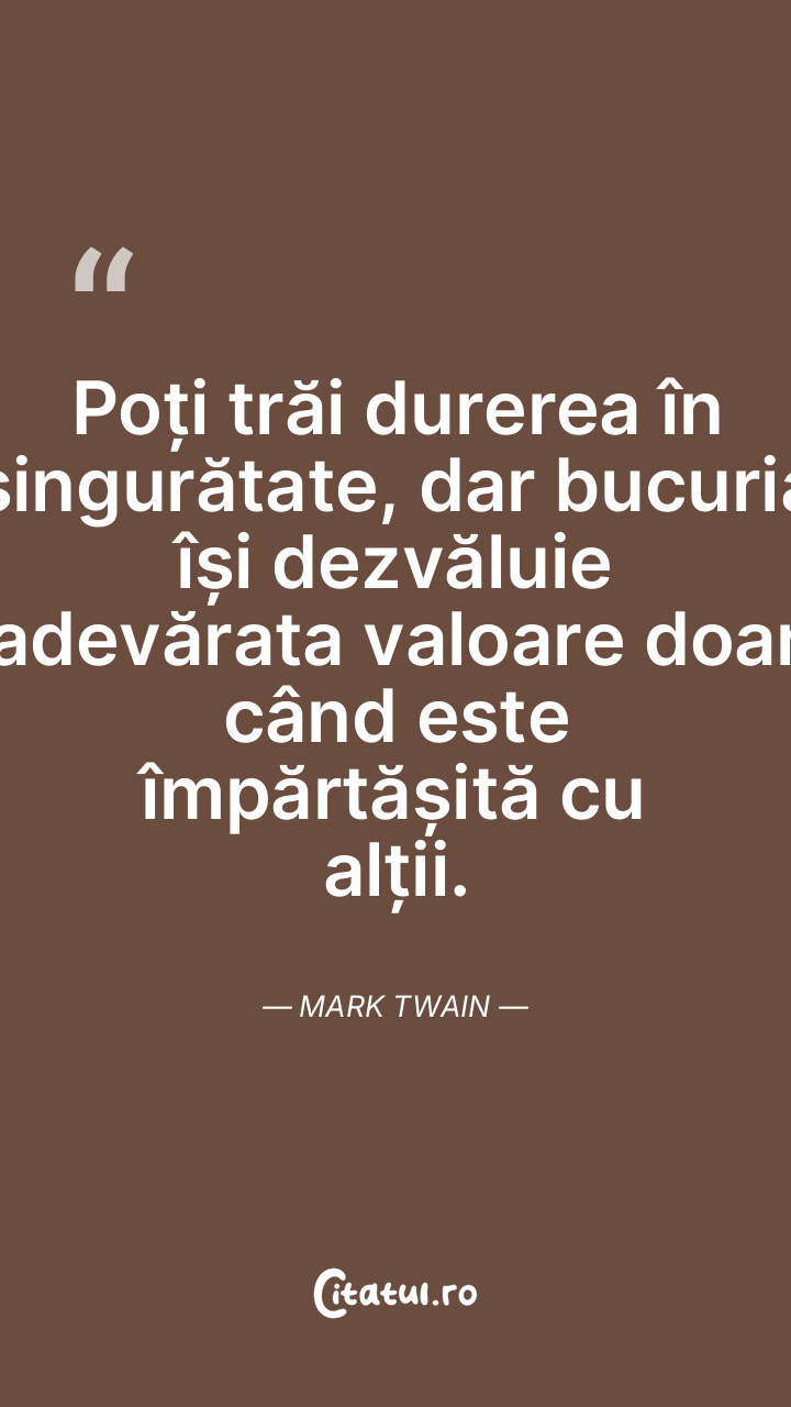 Poți trăi durerea în singurătate, dar bucuria își dezvăluie adevărata valoare doar când este împărtășită cu alții. Mark Twain