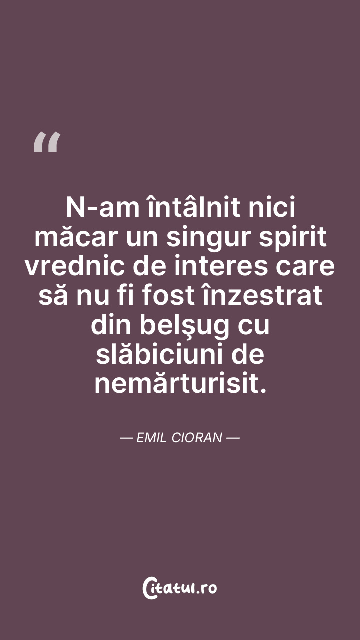 N-am întâlnit nici măcar un singur spirit vrednic de interes care să nu fi fost înzestrat din belşug cu slăbiciuni de nemărturisit. Emil Cioran