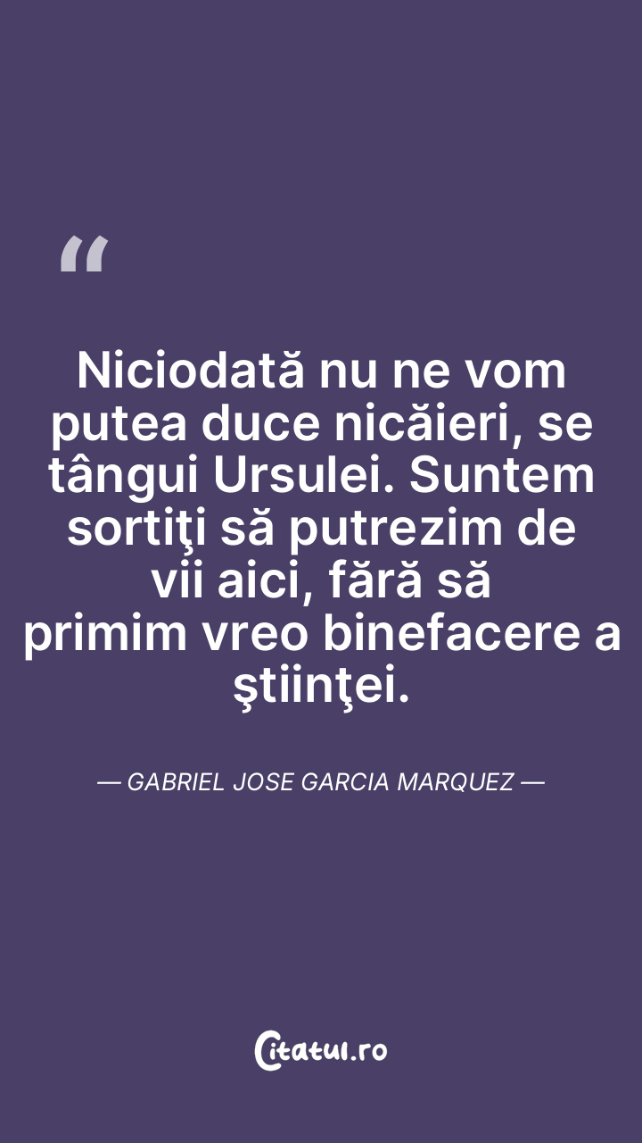Niciodată nu ne vom putea duce nicăieri, se tângui Ursulei. Suntem sortiţi să putrezim de vii aici, fără să primim vreo binefacere a ştiinţei. Gabriel Jose Garcia Marquez