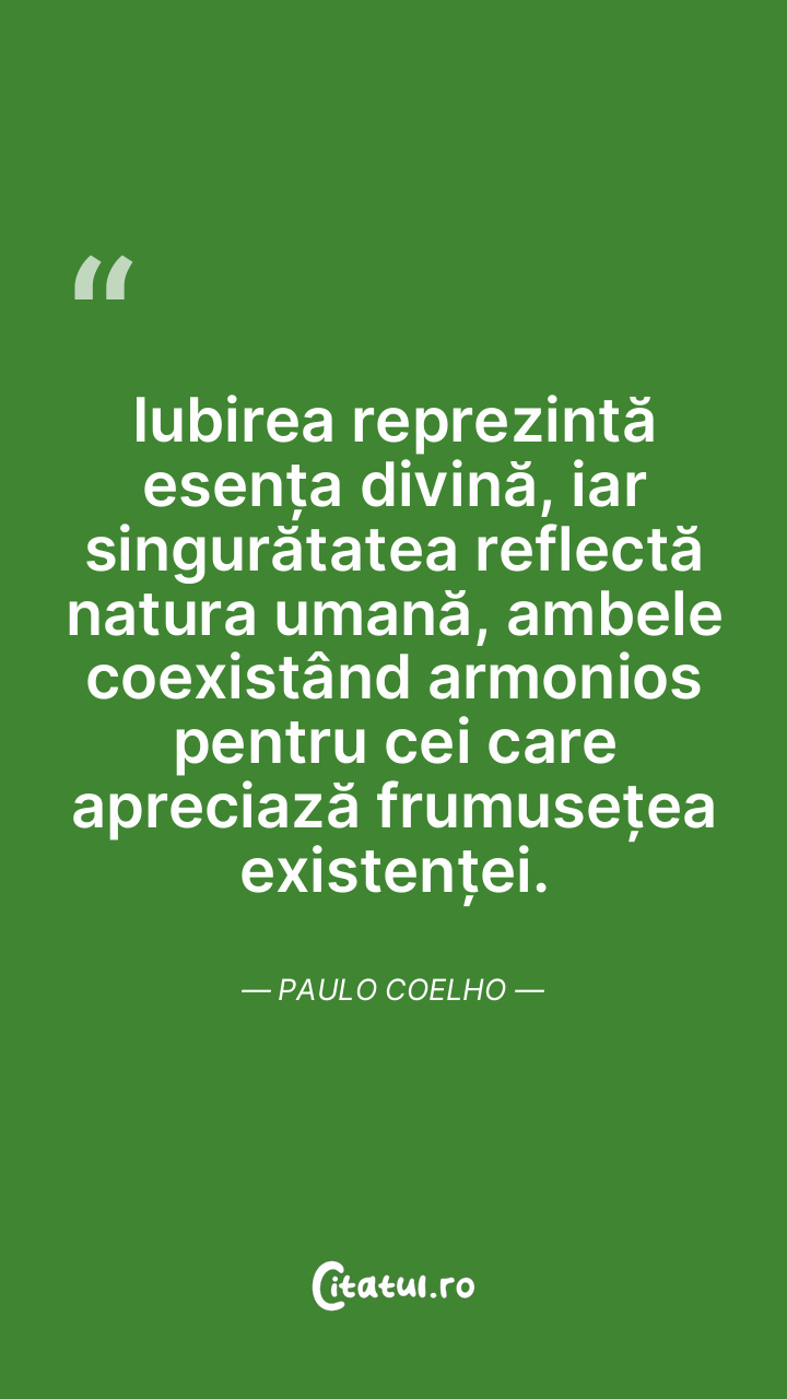 Iubirea reprezintă esența divină, iar singurătatea reflectă natura umană, ambele coexistând armonios pentru cei care apreciază frumusețea existenței. Paulo Coelho
