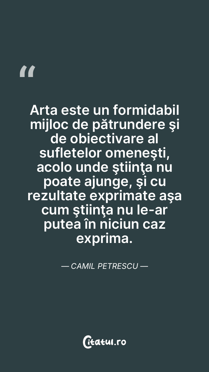 Arta este un formidabil mijloc de pătrundere şi de obiectivare al sufletelor omeneşti, acolo unde ştiinţa nu poate ajunge, şi cu rezultate exprimate aşa cum ştiinţa nu le-ar putea în niciun caz exprima. Camil Petrescu