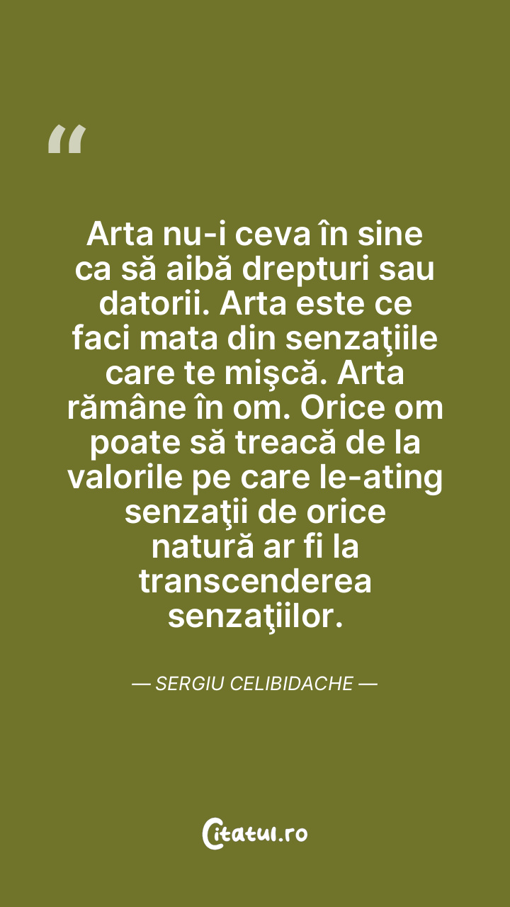Arta nu-i ceva în sine ca să aibă drepturi sau datorii. Arta este ce faci mata din senzaţiile care te mişcă. Arta rămâne în om. Orice om poate să treacă de la valorile pe care le-ating senzaţii de orice natură ar fi la transcenderea senzaţiilor. Sergiu Celibidache