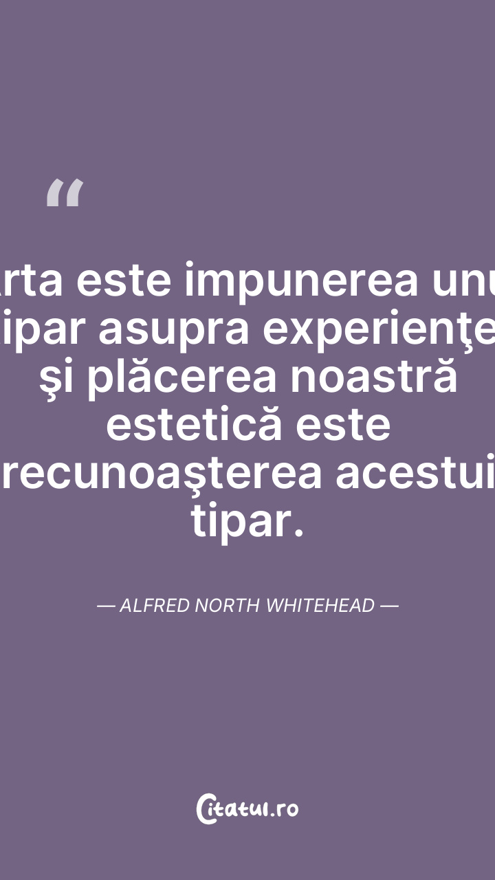 Arta este impunerea unui tipar asupra experienţei şi plăcerea noastră estetică este recunoaşterea acestui tipar. Alfred North Whitehead