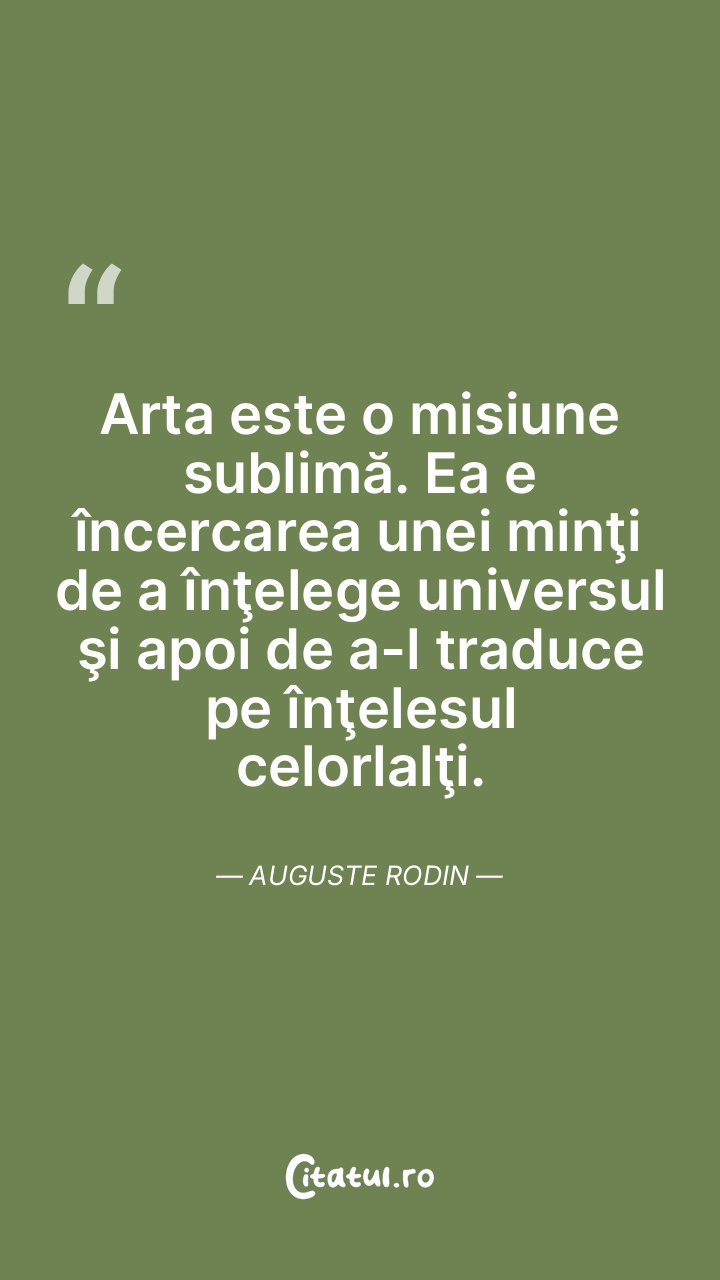 Arta este o misiune sublimă. Ea e încercarea unei minţi de a înţelege universul şi apoi de a-l traduce pe înţelesul celorlalţi. Auguste Rodin