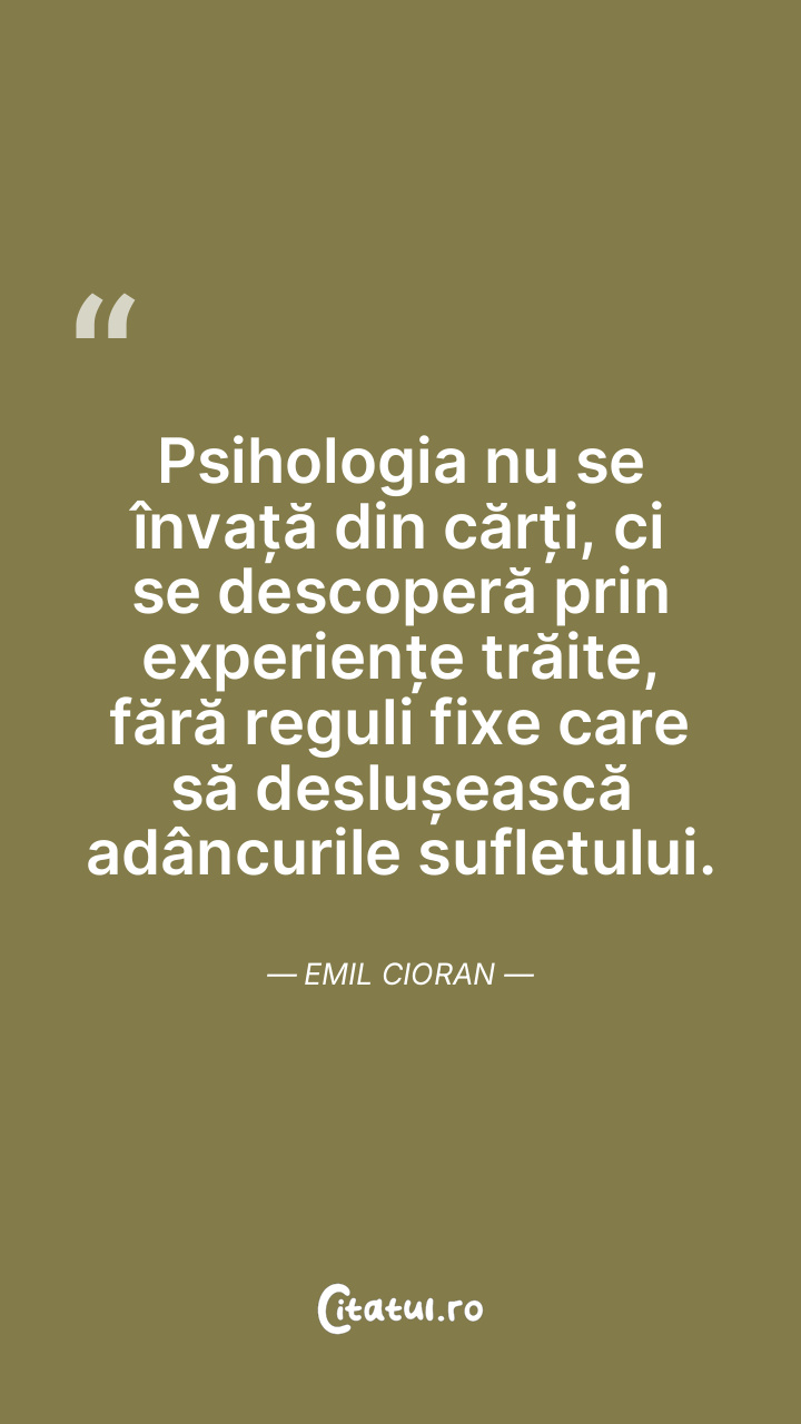 Psihologia nu se învață din cărți, ci se descoperă prin experiențe trăite, fără reguli fixe care să deslușească adâncurile sufletului. Emil Cioran