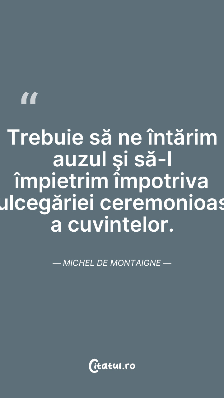 Trebuie să ne întărim auzul şi să-l împietrim împotriva dulcegăriei ceremonioase a cuvintelor. Michel de Montaigne