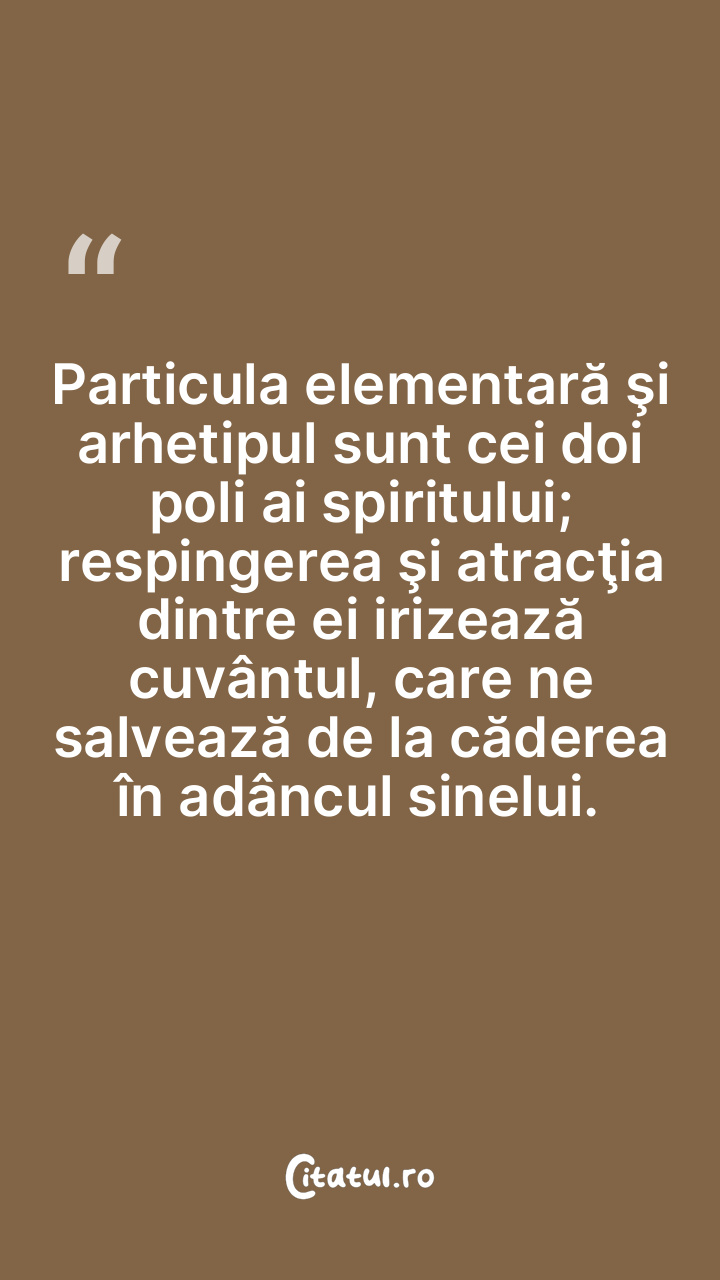 Particula elementară şi arhetipul sunt cei doi poli ai spiritului; respingerea şi atracţia dintre ei irizează cuvântul, care ne salvează de la căderea în adâncul sinelui.
