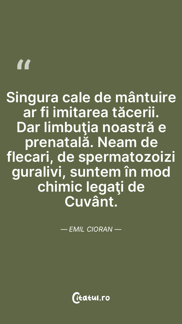 Singura cale de mântuire ar fi imitarea tăcerii. Dar limbuţia noastră e prenatală. Neam de flecari, de spermatozoizi guralivi, suntem în mod chimic legaţi de Cuvânt. Emil Cioran