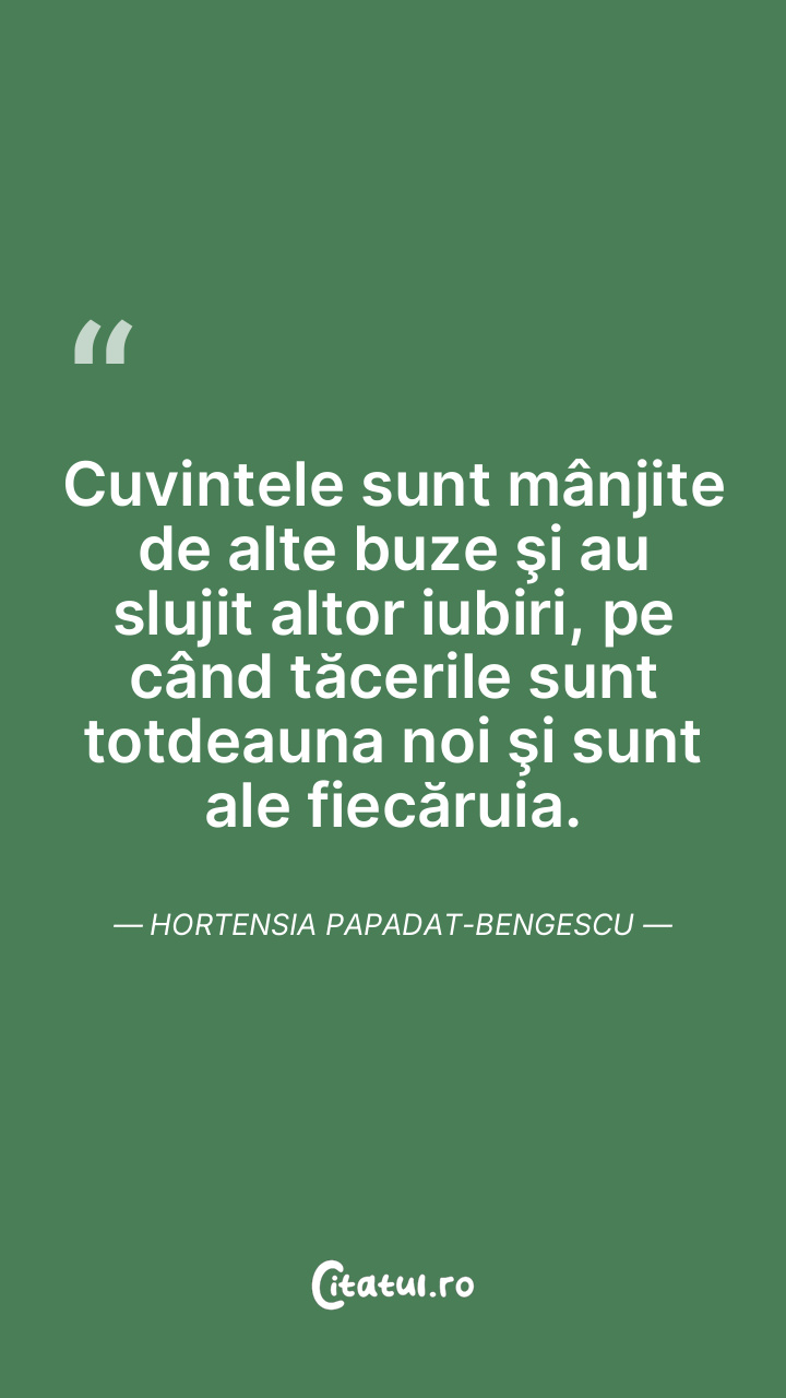 Cuvintele sunt mânjite de alte buze şi au slujit altor iubiri, pe când tăcerile sunt totdeauna noi şi sunt ale fiecăruia. Hortensia Papadat-Bengescu