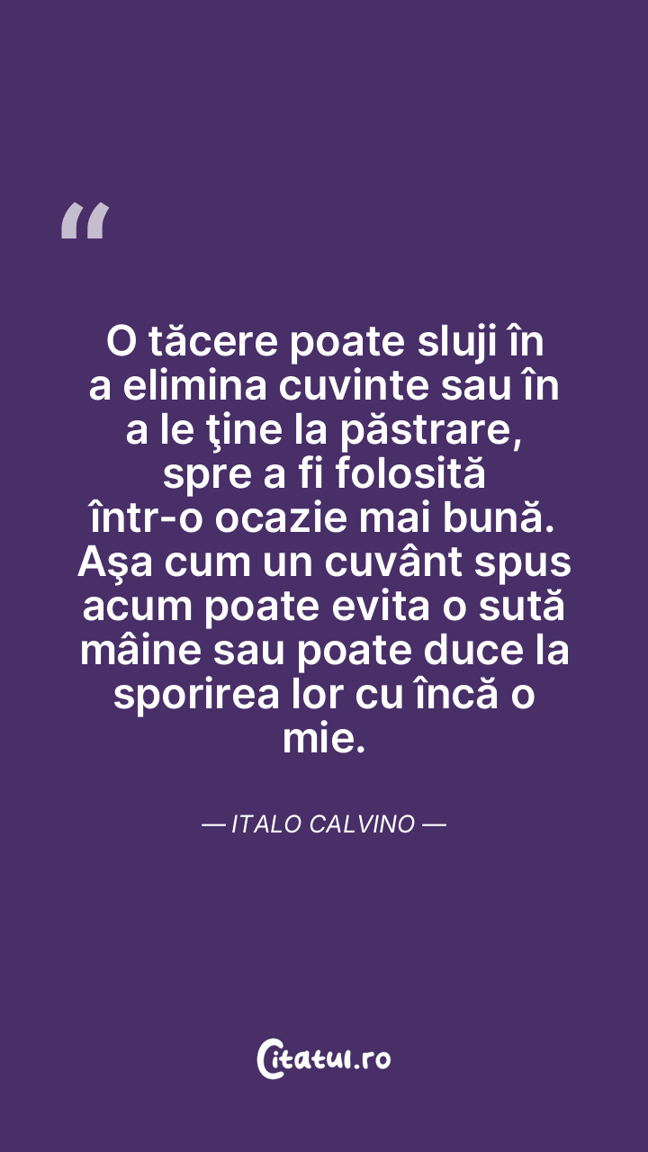 O tăcere poate sluji în a elimina cuvinte sau în a le ţine la păstrare, spre a fi folosită într-o ocazie mai bună. Aşa cum un cuvânt spus acum poate evita o sută mâine sau poate duce la sporirea lor cu încă o mie. Italo Calvino