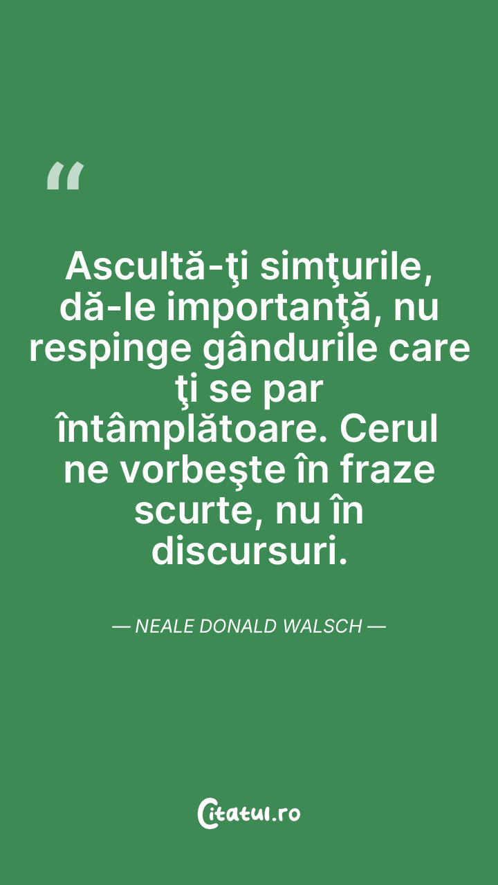 Ascultă-ţi simţurile, dă-le importanţă, nu respinge gândurile care ţi se par întâmplătoare. Cerul ne vorbeşte în fraze scurte, nu în discursuri. Neale Donald Walsch