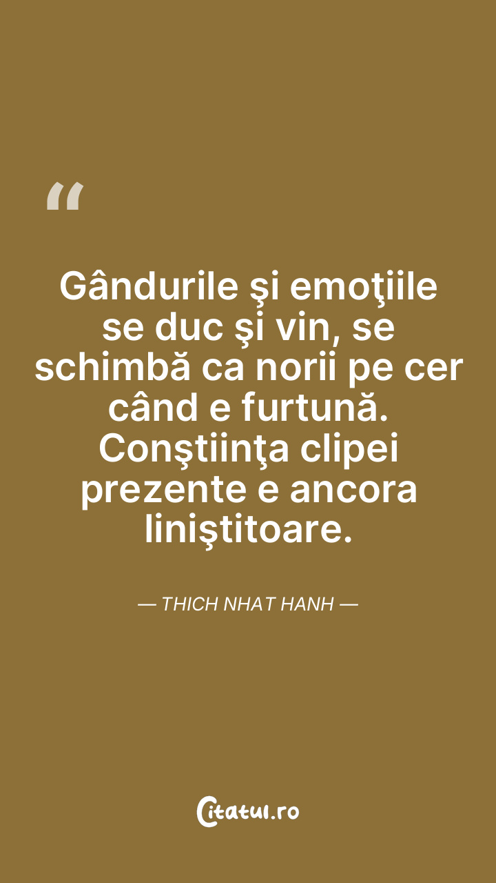Gândurile şi emoţiile se duc şi vin, se schimbă ca norii pe cer când e furtună. Conştiinţa clipei prezente e ancora liniştitoare. Thich Nhat Hanh