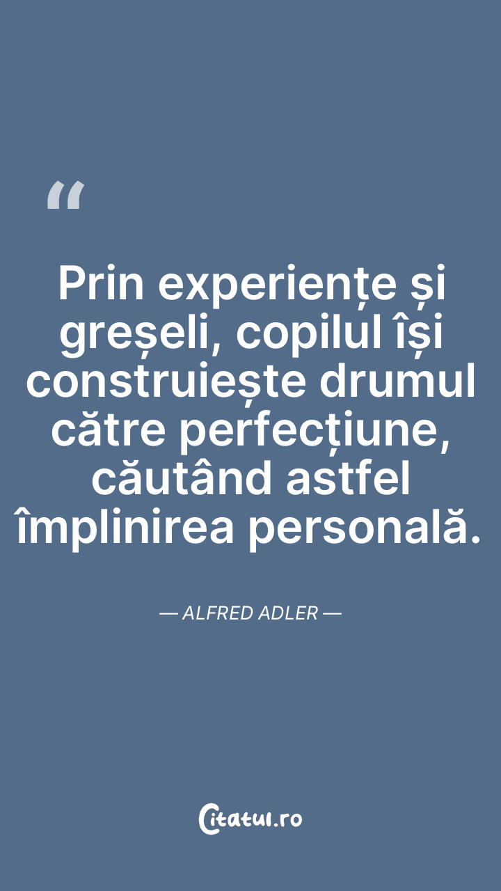 Prin experiențe și greșeli, copilul își construiește drumul către perfecțiune, căutând astfel împlinirea personală. Alfred Adler