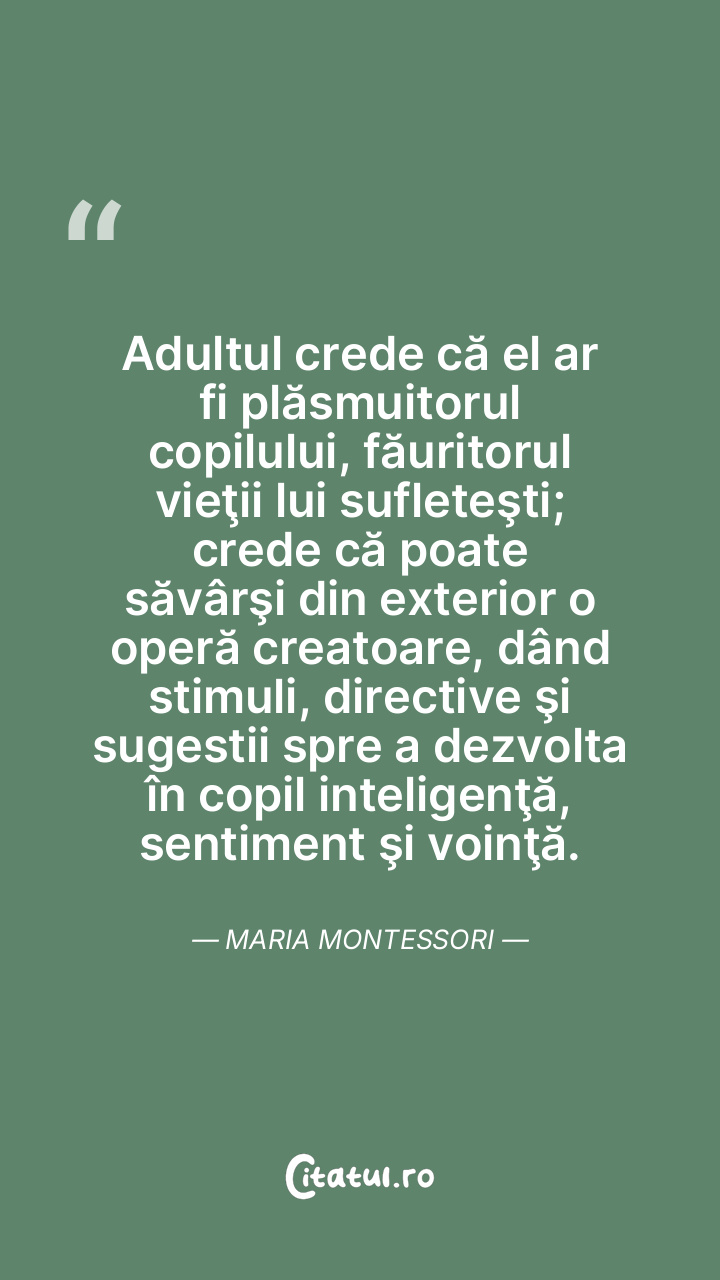 Adultul crede că el ar fi plăsmuitorul copilului, făuritorul vieţii lui sufleteşti; crede că poate săvârşi din exterior o operă creatoare, dând stimuli, directive şi sugestii spre a dezvolta în copil inteligenţă, sentiment şi voinţă. Maria Montessori