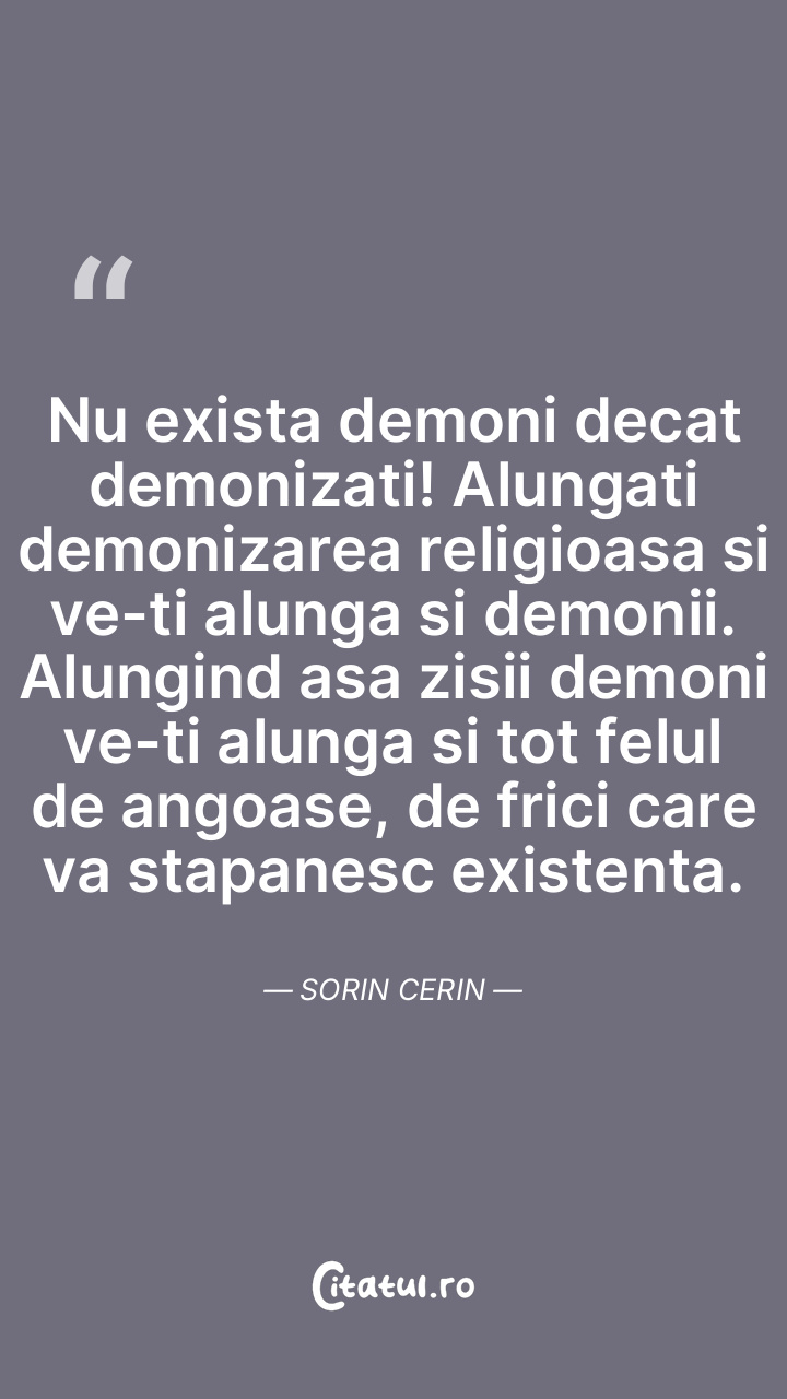 Nu exista demoni decat demonizati! Alungati demonizarea religioasa si ve-ti alunga si demonii. Alungind asa zisii demoni ve-ti alunga si tot felul de angoase, de frici care va stapanesc existenta. Sorin Cerin
