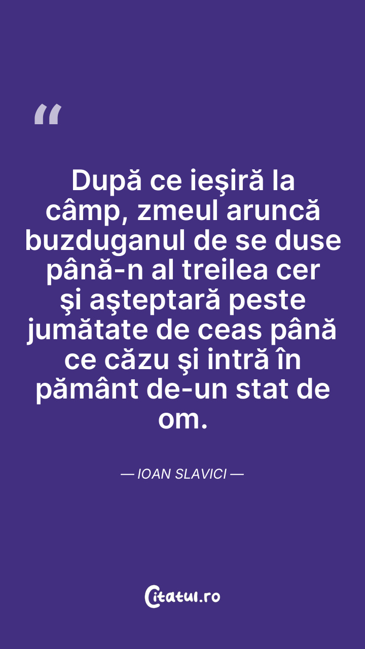 După ce ieşiră la câmp, zmeul aruncă buzduganul de se duse până-n al treilea cer şi aşteptară peste jumătate de ceas până ce căzu şi intră în pământ de-un stat de om. Ioan Slavici