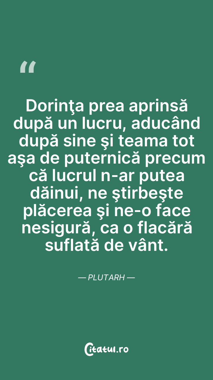 Dorinţa prea aprinsă după un lucru, aducând după sine şi teama tot aşa de puternică precum că lucrul n-ar putea dăinui, ne ştirbeşte plăcerea şi ne-o face nesigură, ca o flacără suflată de vânt. Plutarh