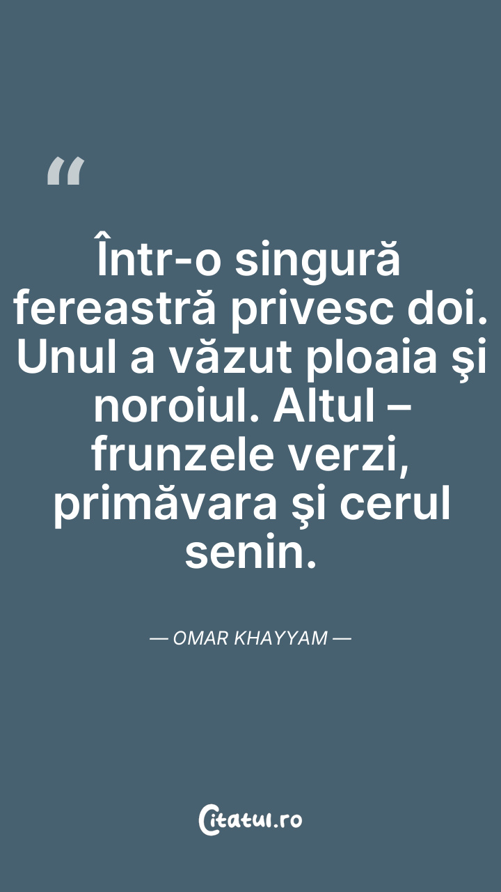 Într-o singură fereastră privesc doi. Unul a văzut ploaia şi noroiul. Altul – frunzele verzi, primăvara şi cerul senin. Omar Khayyam