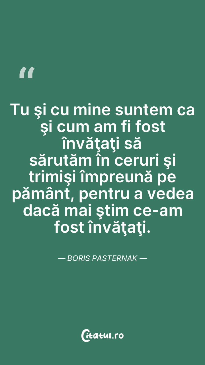 Tu şi cu mine suntem ca şi cum am fi fost învăţaţi să sărutăm în ceruri şi trimişi împreună pe pământ, pentru a vedea dacă mai ştim ce-am fost învăţaţi. Boris Pasternak