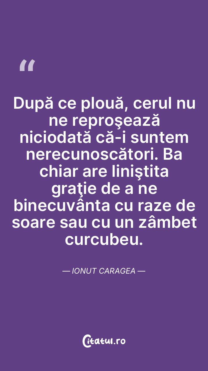 După ce plouă, cerul nu ne reproşează niciodată că-i suntem nerecunoscători. Ba chiar are liniştita graţie de a ne binecuvânta cu raze de soare sau cu un zâmbet curcubeu. Ionut Caragea