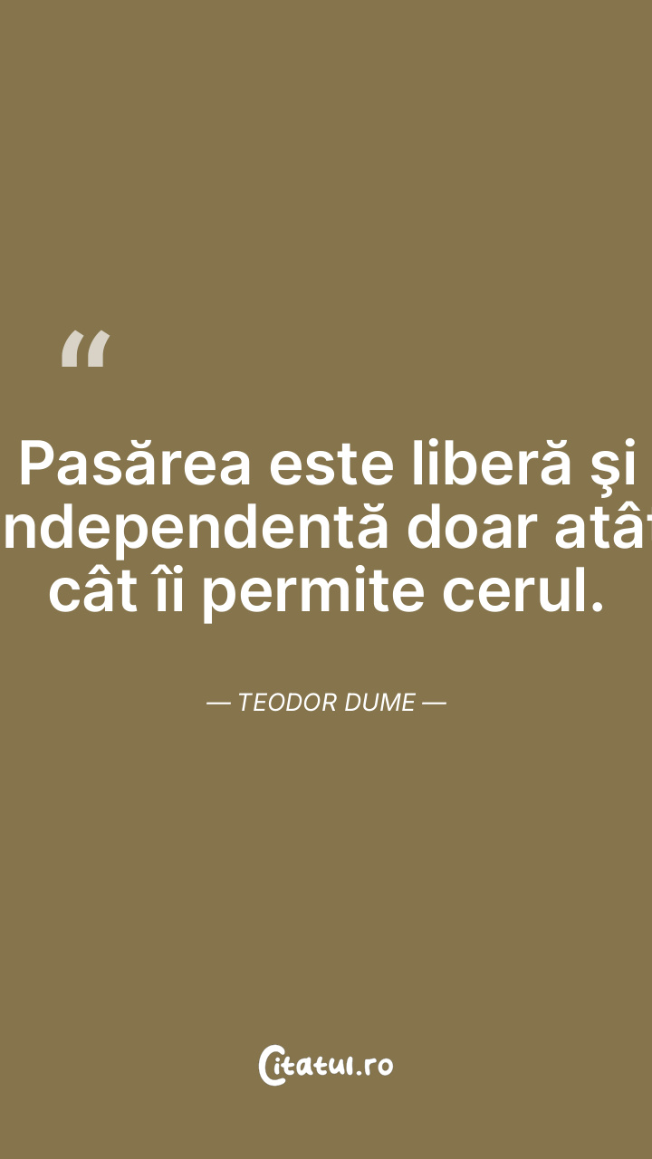 Pasărea este liberă şi independentă doar atât cât îi permite cerul. Teodor Dume