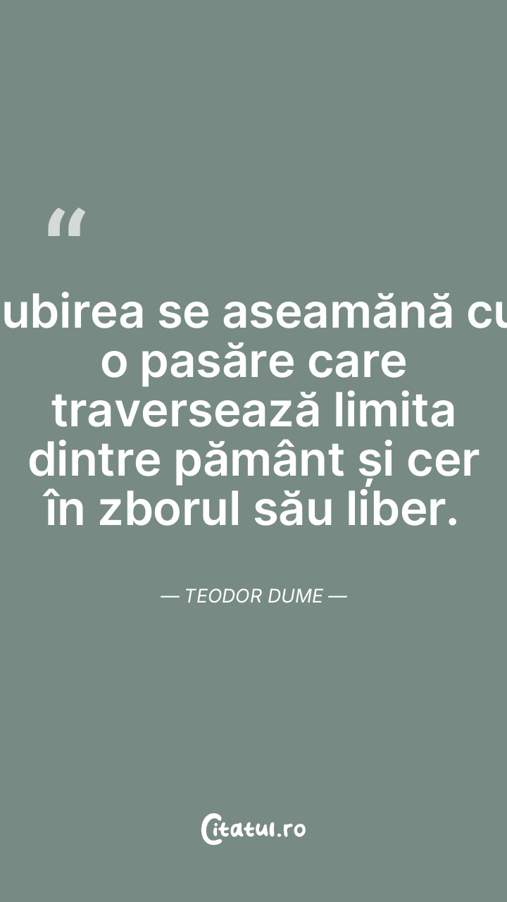 Iubirea se aseamănă cu o pasăre care traversează limita dintre pământ și cer în zborul său liber. Teodor Dume