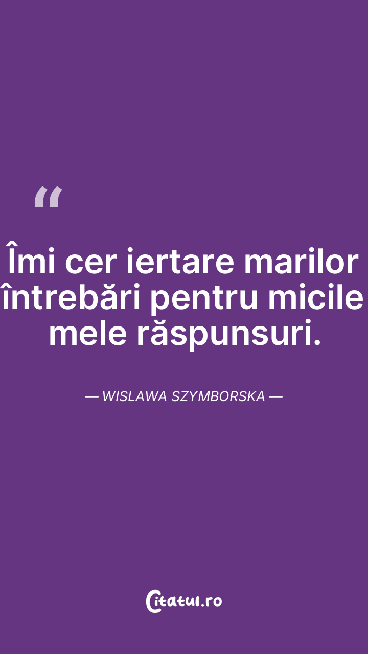 Îmi cer iertare marilor întrebări pentru micile mele răspunsuri. Wislawa Szymborska